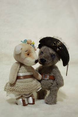 Джо и Софи ростом 8 см, лапки и голова на шплинтах, глазки стеклянные, мордочка валяная, тонировка масляными красками, наполнитель шерсть. Джо - материал: вискоза, шляпа и пояс ручной работы, серебряная цепочка.