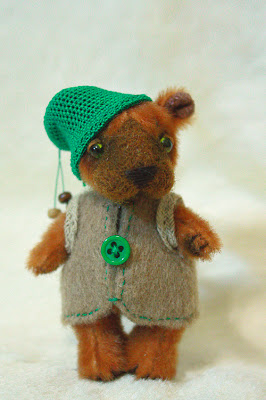 "Миша" - ростом 8 см, материал - Sassy, лапки и голова на шплинтах, глазки стеклянные, мордочка валяная, тонировка масляными красками, наполнитель шерсть, шапка вязаная крючком из нитки №40 (снимается), пальто не снимается.
